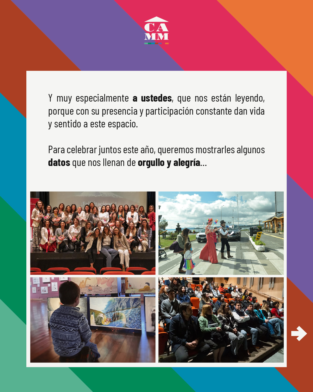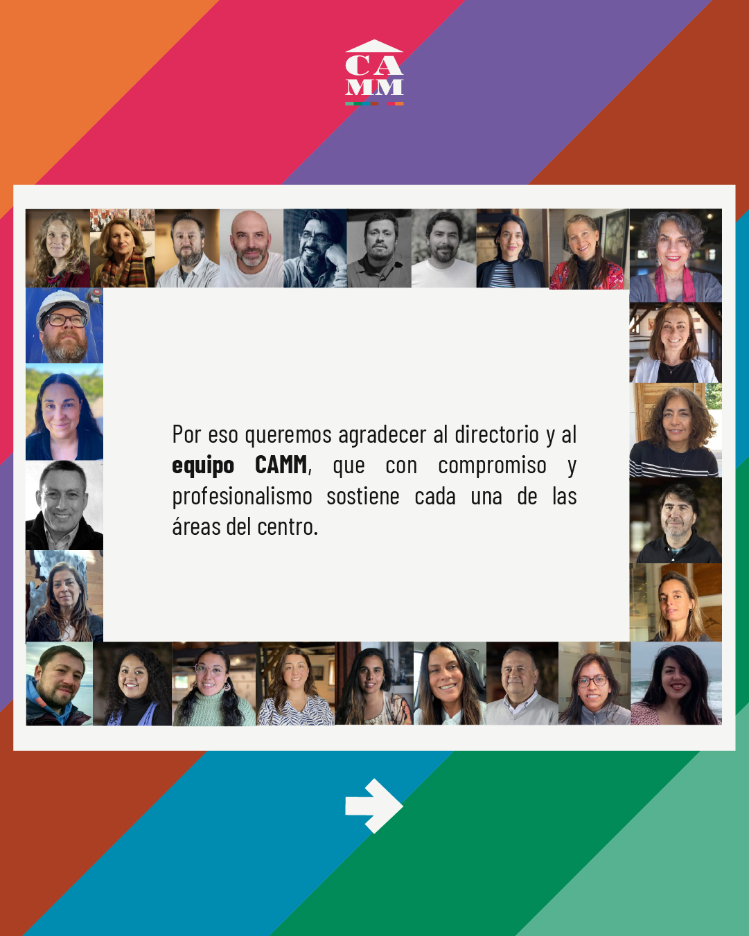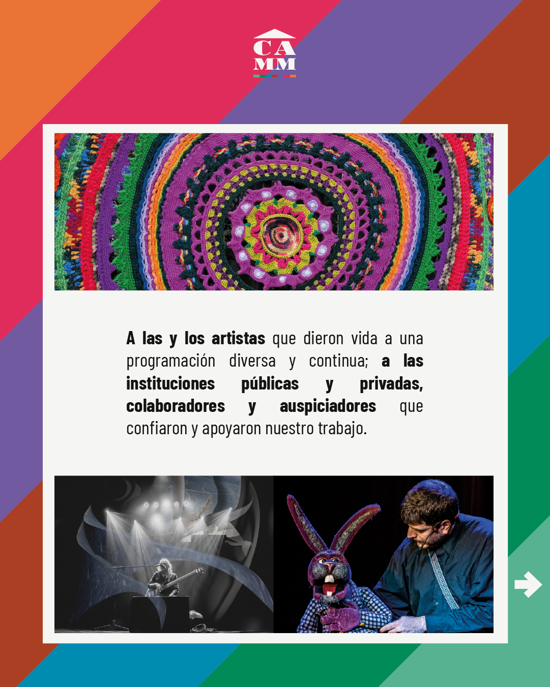 Gracias a artistas, equipos, las instituciones públicas y privadas, colaboradores y auspiciadores que confiaron en nuestro trabajo; y muy especialmente a nuestros públicos por cada momento y por dar vida a nuestro CAMM.